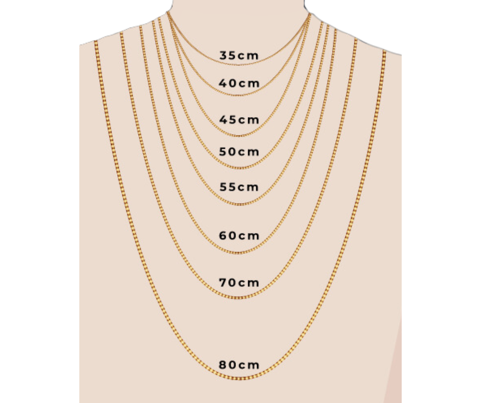 é medido da nuca até à maior distância de suspensão, os nossos colares variam entre 35 cm e 60 cm de comprimento + 5cm de extensão.